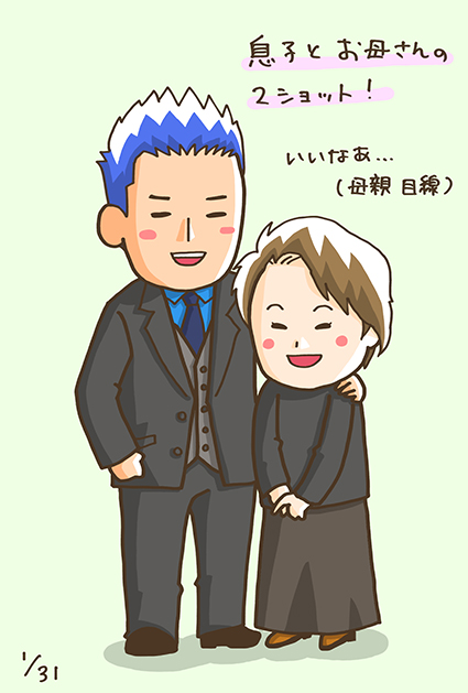 今回の二十歳の記念写真、ご本人が「撮りたい」と言ってくださったそうです。嬉しいなぁ…。せっかくなのでお母さんとふたりのカットも撮らせてもらいました(なぜかイラストで失礼します)