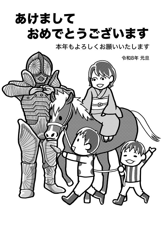家族写真ならぬ家族イラスト年賀状。毎年お父さんだけはウルトラマンに出てくる怪獣です。今年は「甲冑星人ボーグ星人」だそうです。午年なので奥さんを馬に乗せて、子どもたちは騎手になってもらいました。設定めちゃくちゃだな。