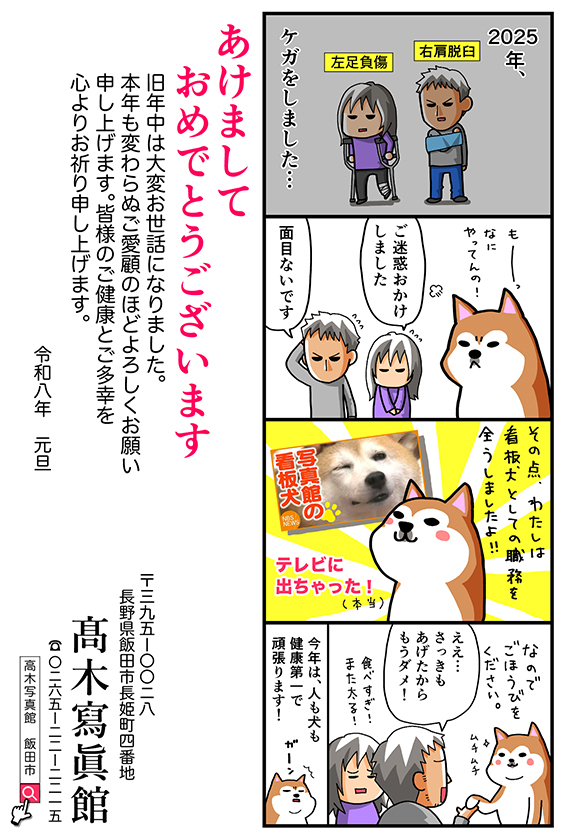 髙木写真館の年賀状です。年末、仕事納めをして大掃除やらなんやらが終わってから描き始めて投函するので、「元旦」とは書いてありますがたぶん元旦には届いていないと思います…