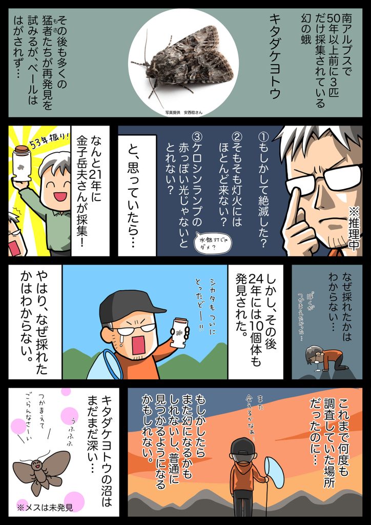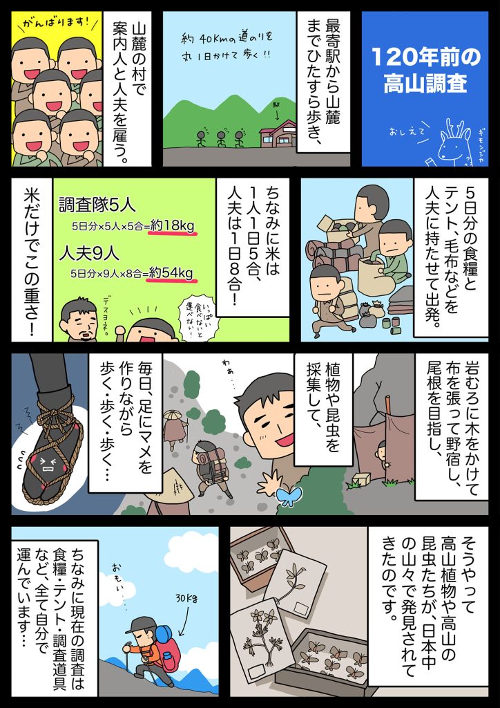 2025年に飯田市美術博物館で開催された企画展「南アルプス博物学の120年」の展示用に描いたマンガです。難しい内容の展示を、ちょっとだけやわらかくできたとかできてないとか…。